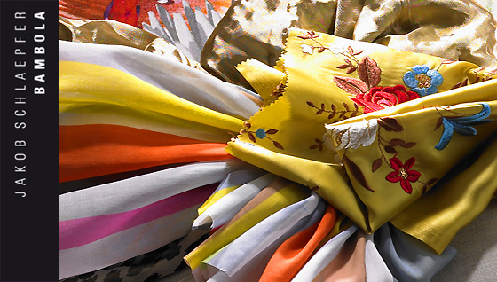 Das Sortiment der Jakob Schläpfer AG besticht durch seine Qualität und seine Vielfalt – von Uni-Seiden wie Tafte, Satins, Crêpes de Chine über Leinen- und Wollqualitäten sowie Tülle, Samte und Fantasie-Gewebe bis hin zu Tweeds für den traditionellen Tailleur.